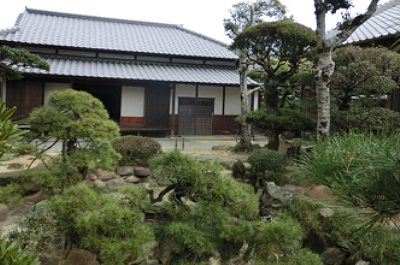Black pine trees and blue stones are aesthetically arranged in the garden surrounded with traditional neribei (mud-walls).